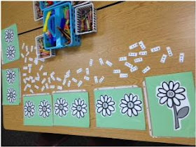 This math station put the kiddos knowledge of adding into play. Take a look. The children had arranged the numbers on the flowers in numerical order, 0-10.